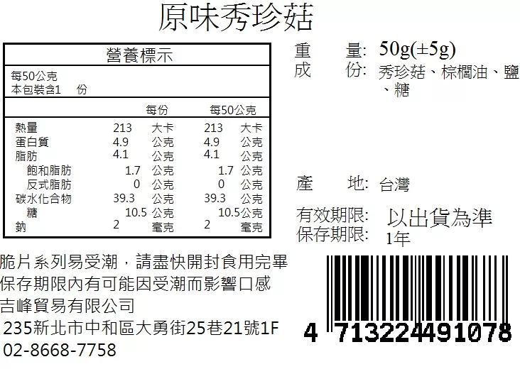 →→→→更多詳細”【午後小食光】菇菇酥-原味秀珍菇50g/包”介紹請點我