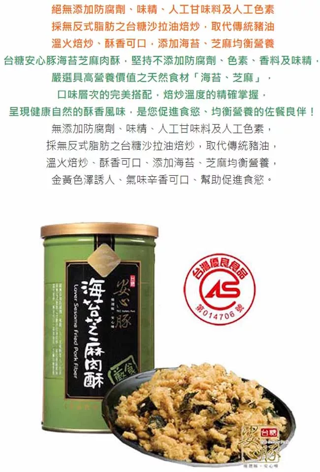 →→→→更多詳細”台糖安心豚 幸福滿點肉酥-肉鬆禮盒6盒-箱(海苔芝麻肉酥+葵花油肉酥)”介紹請點我