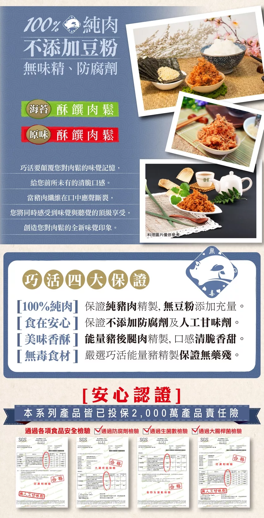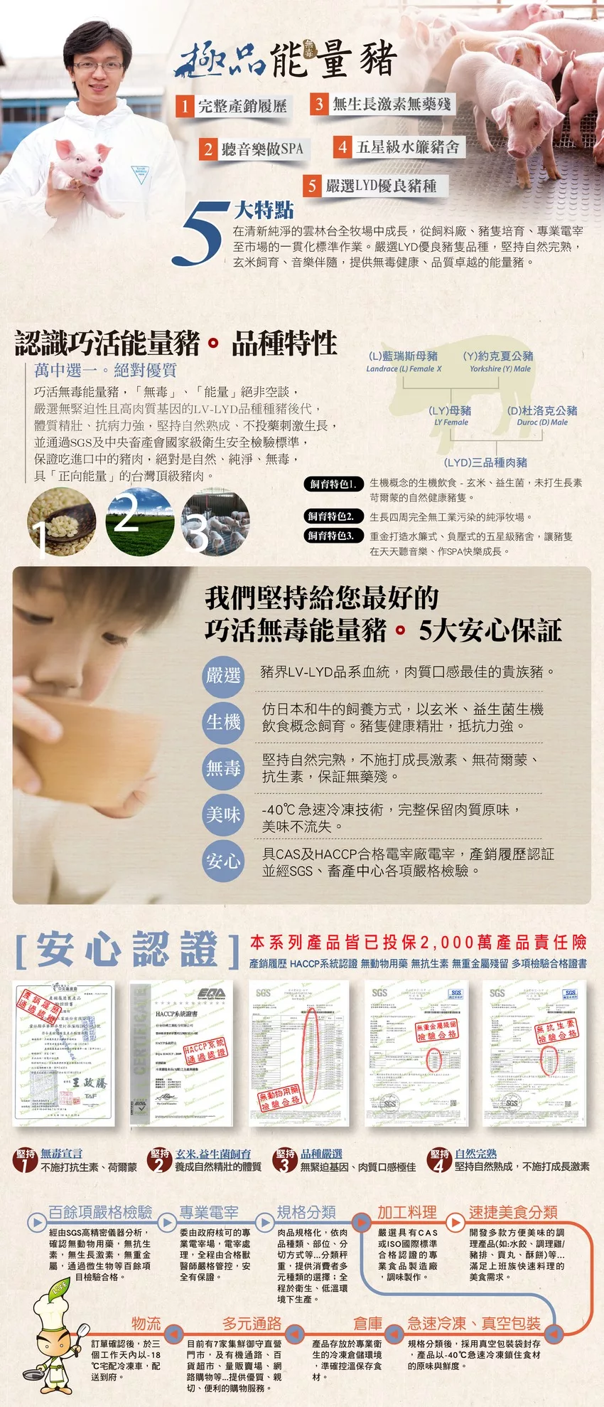 「無毒」、「能量」之名絕非空談,從豬品種的挑選、不投藥刺激生長的品質控管、外部病源完全 隔離的嚴密管理、高衛生標準的牧場,到肉品上市前,SGS及中央畜產會的國家級衛生安全檢驗標準,保證吃進口中的豬肉,絕對是名符其實的最「自然」、「純 淨」、「無毒」具備「正向能量」的台灣頂級豬肉。